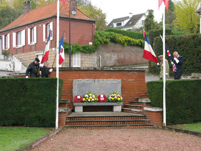 Left- Mike Potter lays the Royal British Legion wreath with standard bearers Tom Walden and Michel Bonneval at the British cemetery. Right - At the 'Monument to the Dead 1914 -1918'