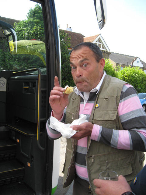 dimanche, le 22 mai. Pour plusieurs d`entre nous, c`était une journée libre pendant laquelle les hôtes britanniques organisaient de différentes activités pour faire plaisir aux visiteurs. Pour d`autres, c`était le défi annuel de match de pétanque et du prix convoité, Les Cendres, que les Anglaîs ne gagnaient plus jaimais depuis 2003. Pas mal de spectateurs se sont réunis pour suivre l`épreuve sportive. Elle allait être une des meilleures et des plus vivement contestées que j`aie jamais vue. Un match de pétanque consiste en deux jeux “triples” suivis de trois jeux “doubles”. Les “triples” ayant fini à égalité, au début des “doubles” les équipes devaient risquer le tout pour le tout. Pendant quelque temps les points indiquaient qu`Eastry allait gagner les jeux tous les trois, mais la situation a bientôt changé et les deux équipes devaient jouer serré sans répit. À l`aide du “bombing” impitoyable et précis au suprême degré de Thierry Ducoin, Thierry et Jacques Daussy ont gagné le jeu contre Trevor Foster et moi-même. (La technique du “bombing” c`est de jeter sa boule à une distance de plus de 6 mètres avec une action dure et merveilleusement précise de sonte qu`elle déplace celle de l`opposition). Cependant, à la piste centrale, Robert Green et Dennis Sivil ont repris des forces et ont battu Patrice Alderweireld et Alain Defebvin – ce qui mettait le match à égalité encore une fois. Tout le monde fixait des yeux Graham Lane et Terry James qui avaient été de force à lutter contre Arnaud et Maxime Devauchelle. À ce moment Terry et Graham étaient les premiers et ne manquaient que de deux points pour gagner. La boule de Terry était le plus prés du cochonet et il ne restait que Graham à jouer. Son premier coup n`a pas réussi à s`arrêter plus près du cochonet que celle de l`opposition; mais à son deuxième coup il a changé de tactique et a réussi un coup à la Thierry, ce qui a knock-outé la boule de l`opposition et a fini par pendre sa place. Ce coup s`appelle un “carreau” et il a donc fait de sorte qu`ils avaient les deux boules les plus près du cochonet, ce qui leur a donné deux points et ainsi les a fait gagner le match: pour le première fois pendant 8 ans, les britanniques ont gagné 3:2. Les Cendres se retrouvaient en Angleterre pour une année au moins! Les capitaines ont fait un échange de cadeaux et on a rapporté les Cendres au “château ancestral”, dans notre nouveau placard d`étalage qu`on a fermé à clé. Les joueurs et leurs familles adoptives se sont retirés dans l`ancient poste d`incendie pour y savourer le lunch anglais traditionnel, le cari all riz, et pour badiner au sujet du match – comment l`a-t-on perdu, comment l`a-t-on gagné?